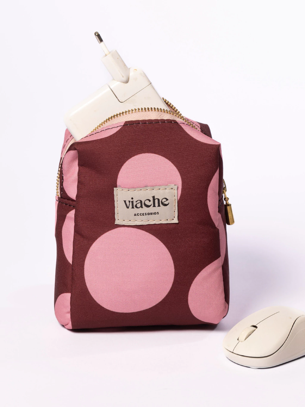 El porta cargadores “Luna Bordó” combina diseño y funcionalidad con el sello inconfundible de VIACHE. Su estampa de grandes círculos rosas sobre fondo bordó transmite energía y estilo, mientras que su estructura acolchada protege tus accesorios tecnológicos. Ideal para guardar el cargador de notebook, el mouse, auriculares o adaptadores con un toque divertido y moderno.