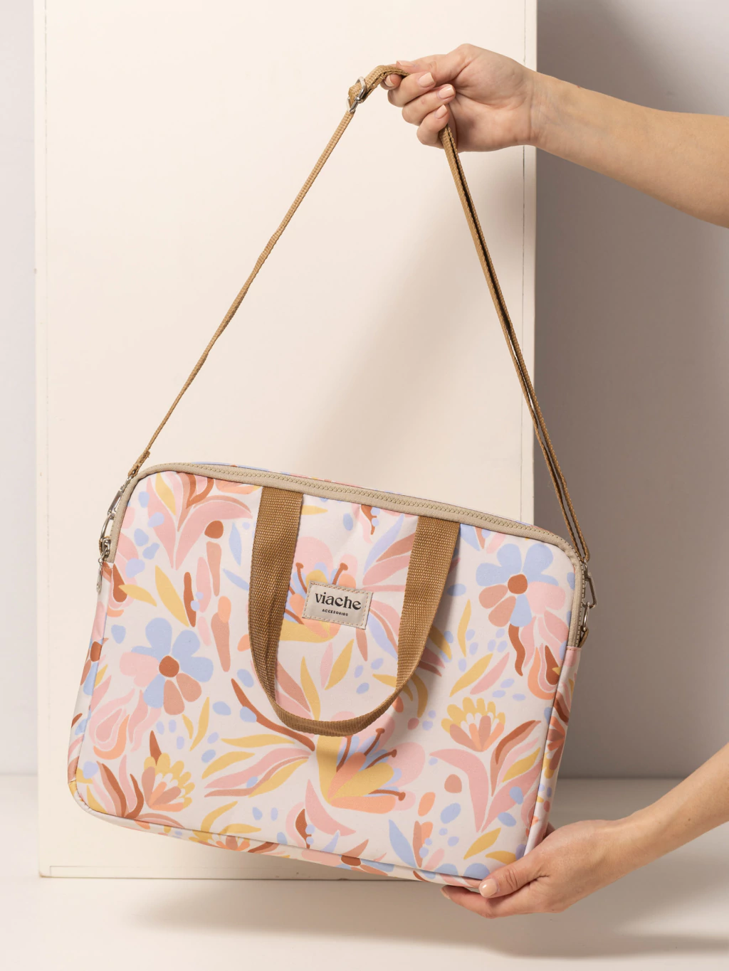 Posee una correa larga regulable y desmontable, además de dos asas cortas para llevarlo en la mano.