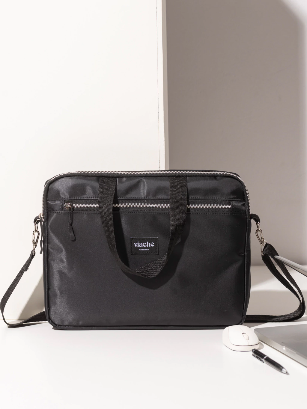 Confeccionado en lona satinada impermeable, con interior de neoprene acolchonado para proteger tu notebook.