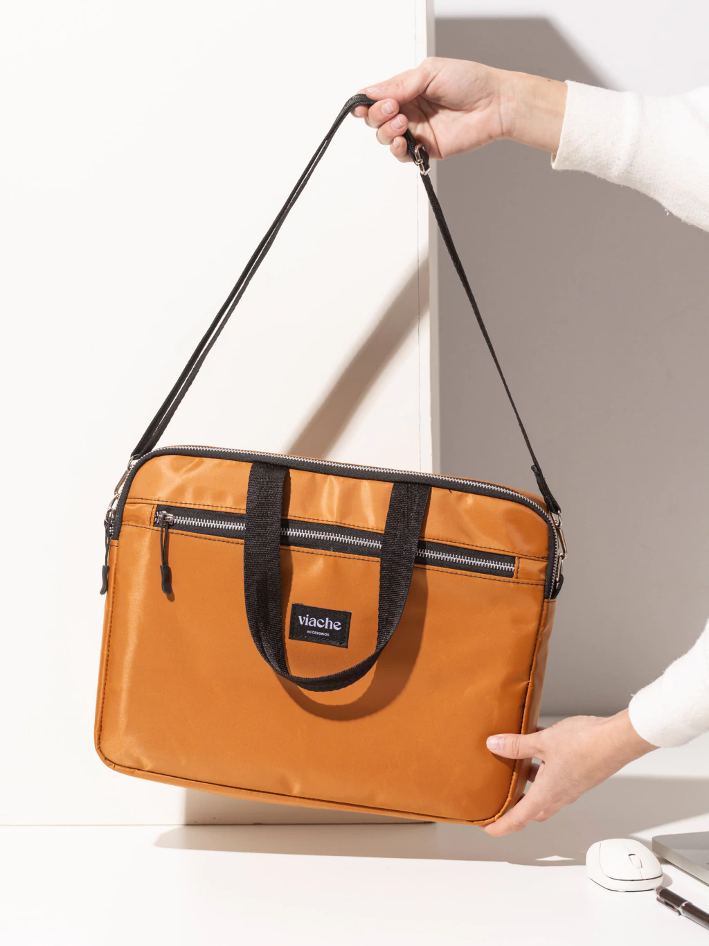 Se puede llevar cómodamente con su correa larga regulable y desmontable, o con sus asas cortas de mano.