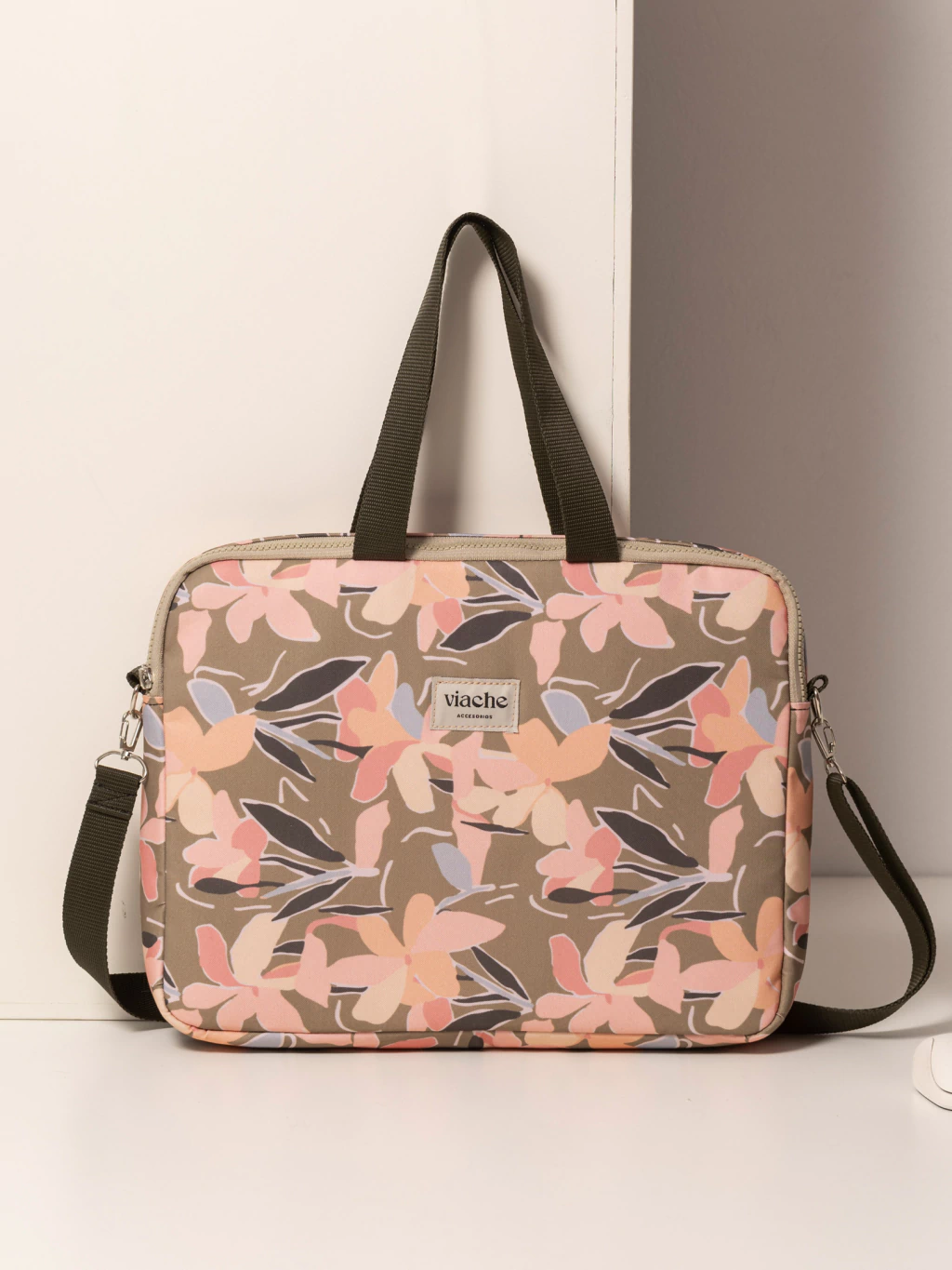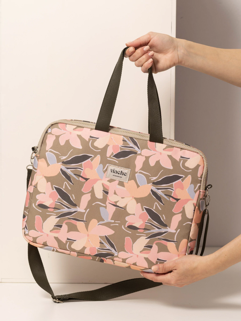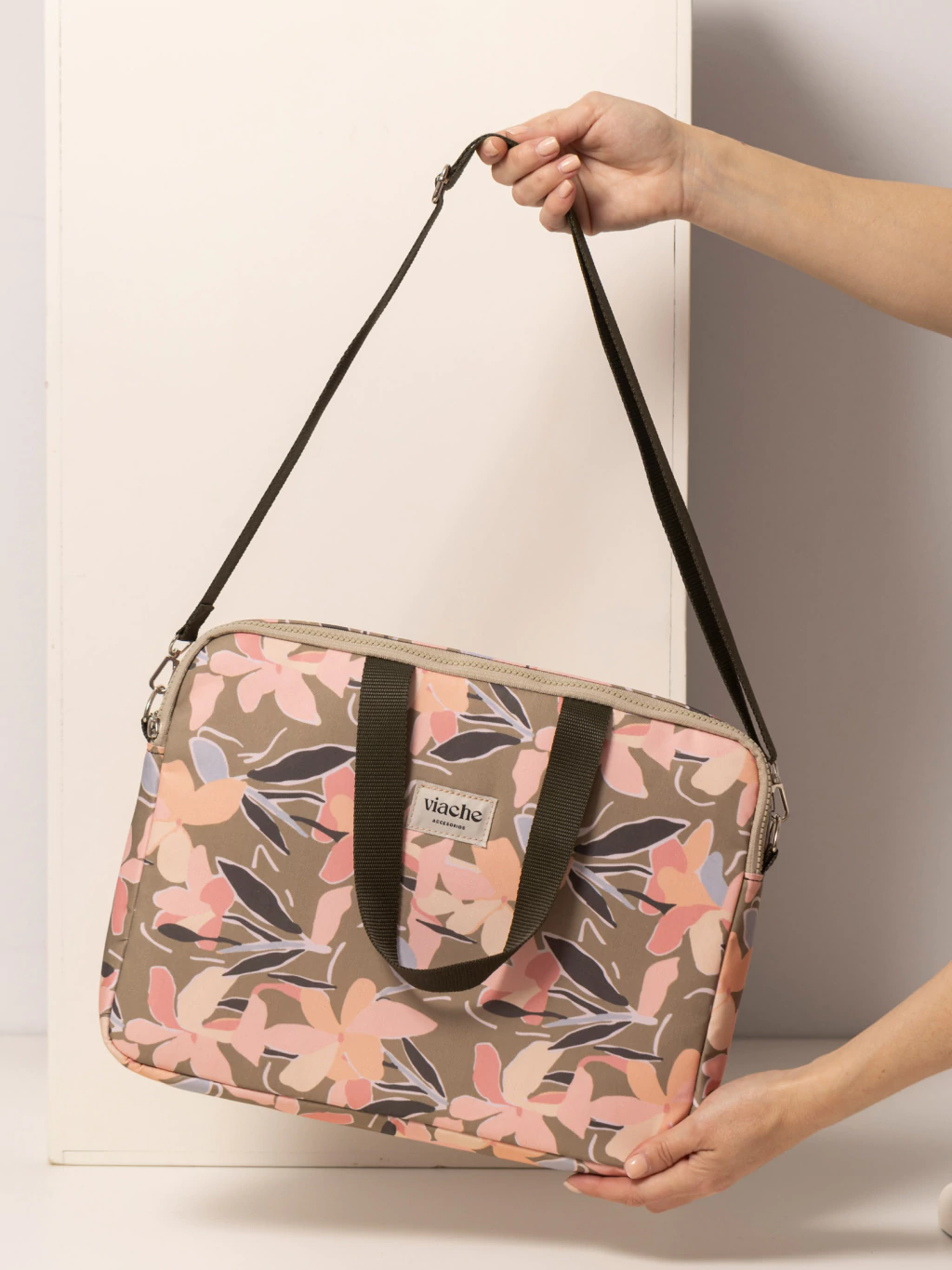 Posee una correa larga regulable y desmontable, además de dos asas cortas para llevarlo en la mano.