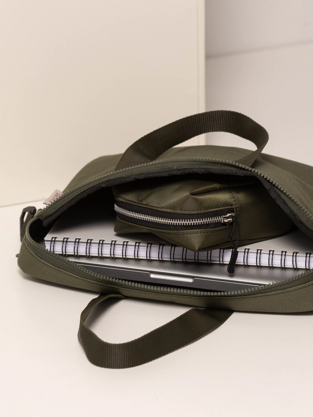 En la parte trasera, incorpora un bolsillo con cierre ideal para llevar documentos o cuadernos.
