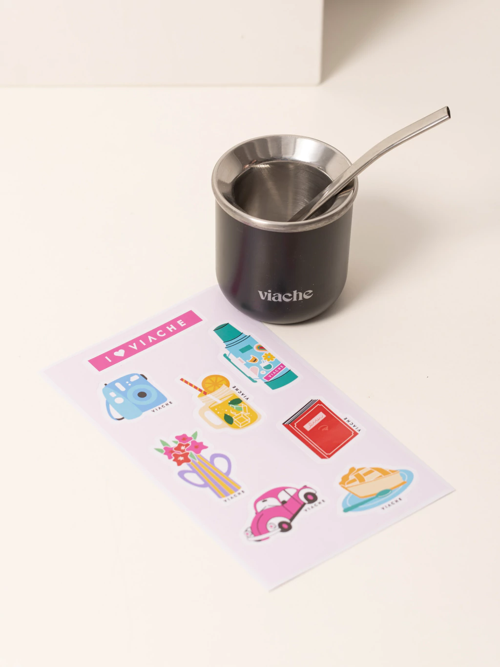 Cada mate incluye una bombilla, una bolsa Zipp para guardarlo sin ensuciar, y una plancha de stickers que te permitirá personalizarlo a tu gusto.