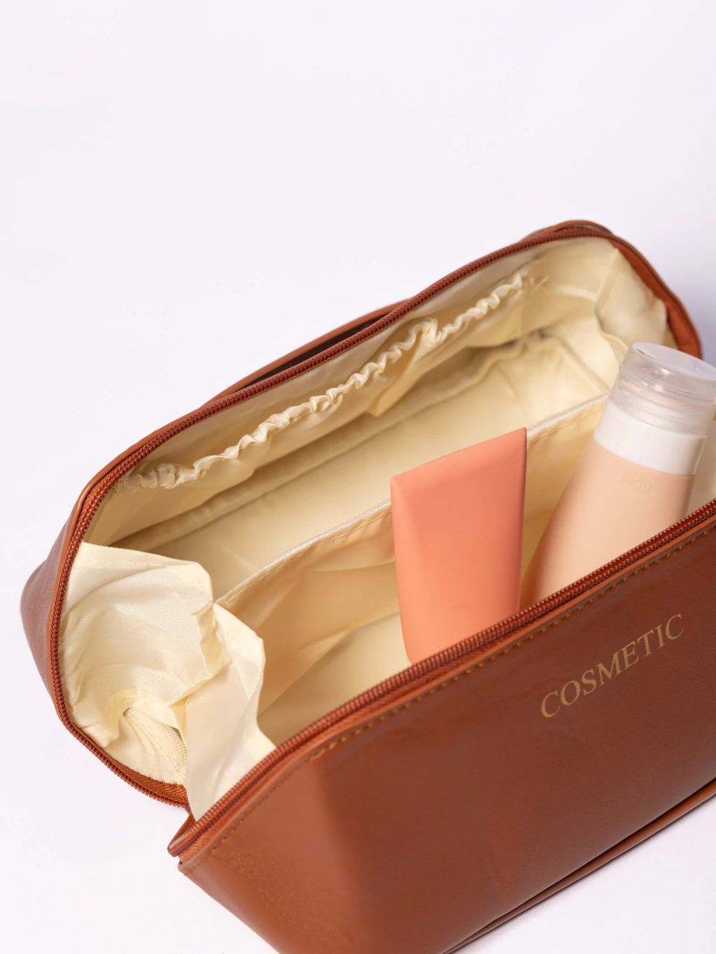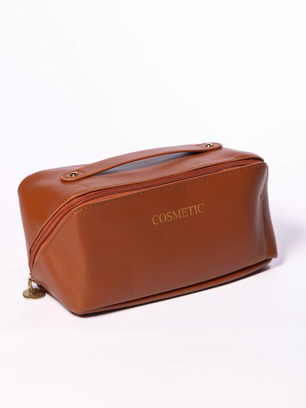 El neceser “Cosmetic Suela” combina practicidad con estilo. Su exterior en eco cuero liso con acabado mate y detalle dorado lo convierte en un clásico moderno. Ideal para viajes o para tener tus cosméticos organizados con un toque de sofisticación.