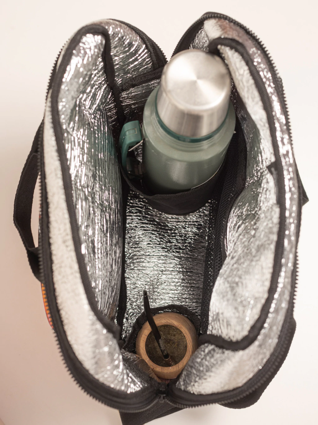 En el interior posee: un compartimiento para llevar tu termo y no se vuelque ( entra un termo Stanley de 1.5 lts. ), otro para llevar tu mate, y un bolsillo para que lleves lo que quieras!