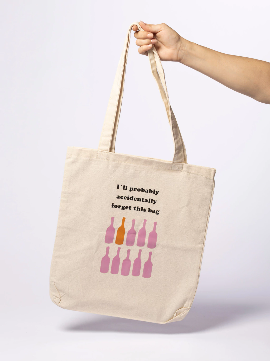 Diseño: frente estampado con frase “I’ll probably accidentally forget this bag” y botellas en tonos pastel